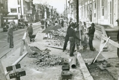 WPA workers replace brick sidewalks with concrete as they widen the street. Café Magnelli, Messimer’s Home Made Candies, and Savoy Restaurant can be seen on the left.