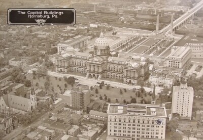 The Pennsylvania Capitol Complex and Surroundings (c1936) In the years leading up to the Depression, many structures were erected around the State Capitol including the South Office Building (1923), North Office Building (1929), State Street Bridge (1930), and Education Building (1931). The Public Works Administration approved $7 million for the Finance Building, under construction in this photo and completed in 1939. |