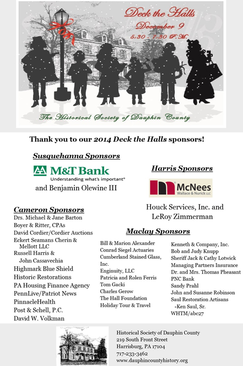 Deck the Halls is THE major fundraising event for the Historical Society of Dauphin County. Income from the event is crucial to supporting our educational programs and research archives, and to maintaining the National Landmark Harris-Cameron Mansion, built in 1766 and entrusted to our care since 1941.