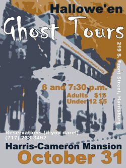 Enjoy a spooky visit to the John Harris-Simon Cameron Mansion at 219 South Front Street in Harrisburg. There will be guided Ghost Tours through the mansion on October 31st at 6:00 pm and 7:30 pm. The first tour will be suitable for families and children, and the second tour is recommended for adults. The guide will tell ghost stories of old Harrisburg and give visitors a rare peek of the mansion by candlelight. Admission is $15 for adults ($10 for members of the Historical Society). Children 12 and under are $5. Space is limited. Please call 233-3462 for reservations.