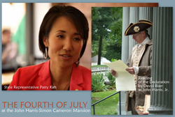 The Historical Society of Dauphin County will present re-enactor David Biser as John Harris, Jr. in publicreadings of the Declaration of Independence on Friday, July 4, from the porch of the John Harris-Simon Cameron Mansion at 219 S. Front Street, Harrisburg. Readings will take place on the hour at 10:00 a.m., 11:00 a.m., noon, and 1:00 p..m. There is no charge to hear the readings and free parking is available behind the mansion.