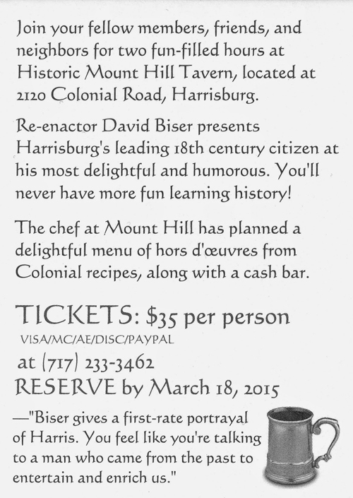 If you have never spent an evening with Mr. Harris, you are in for a treat! Good food, good fun, Colonial games and songs, and lots of conversation with an important historical figure.
